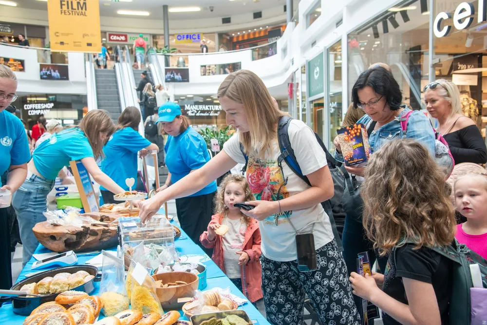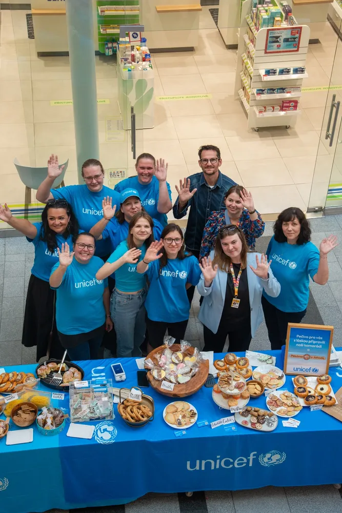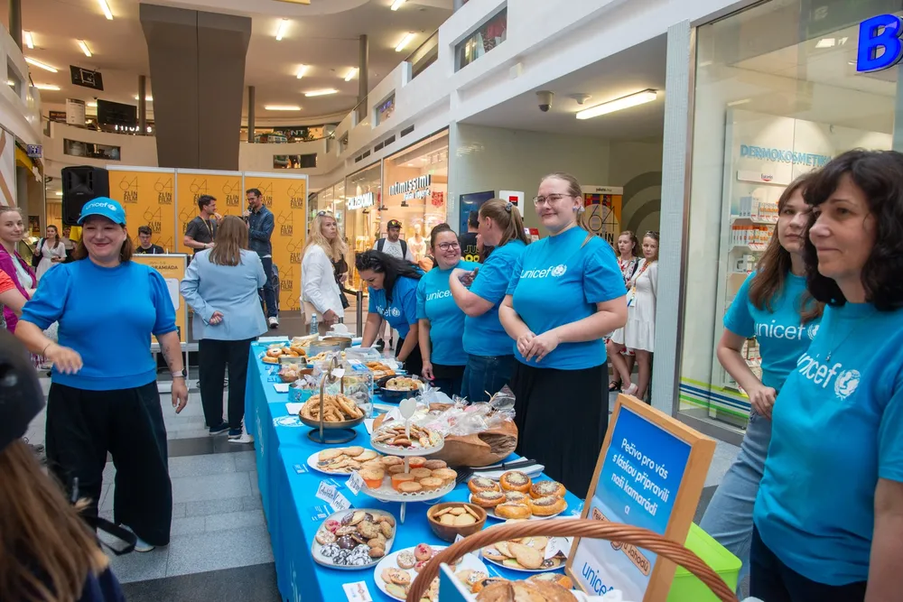 Pečení pro děti s UNICEF ve Zlatém jablku. Různé zákusky a pečivo rozdávali dobrovolníci v obchodním centru Zlaté jablko. Lidé jim za to dávali dobrovolné příspěvky. Peníze z prodeje poputují na podporu programů UNICEF, které jsou zaměřené na pomoc dětem.